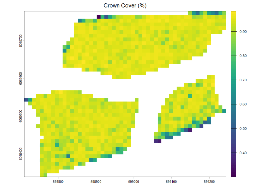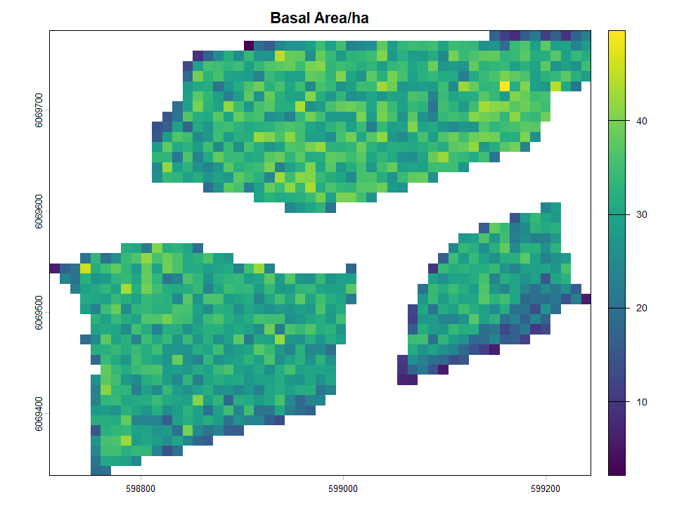 Plot-level field measurements were used to fit predictive models estimating tree attributes across the stand. These models generated stand-wide predictions of DBH, crown diameter, and basal area for each segmented tree, enabling detailed structural mapping at the individual-tree scale.