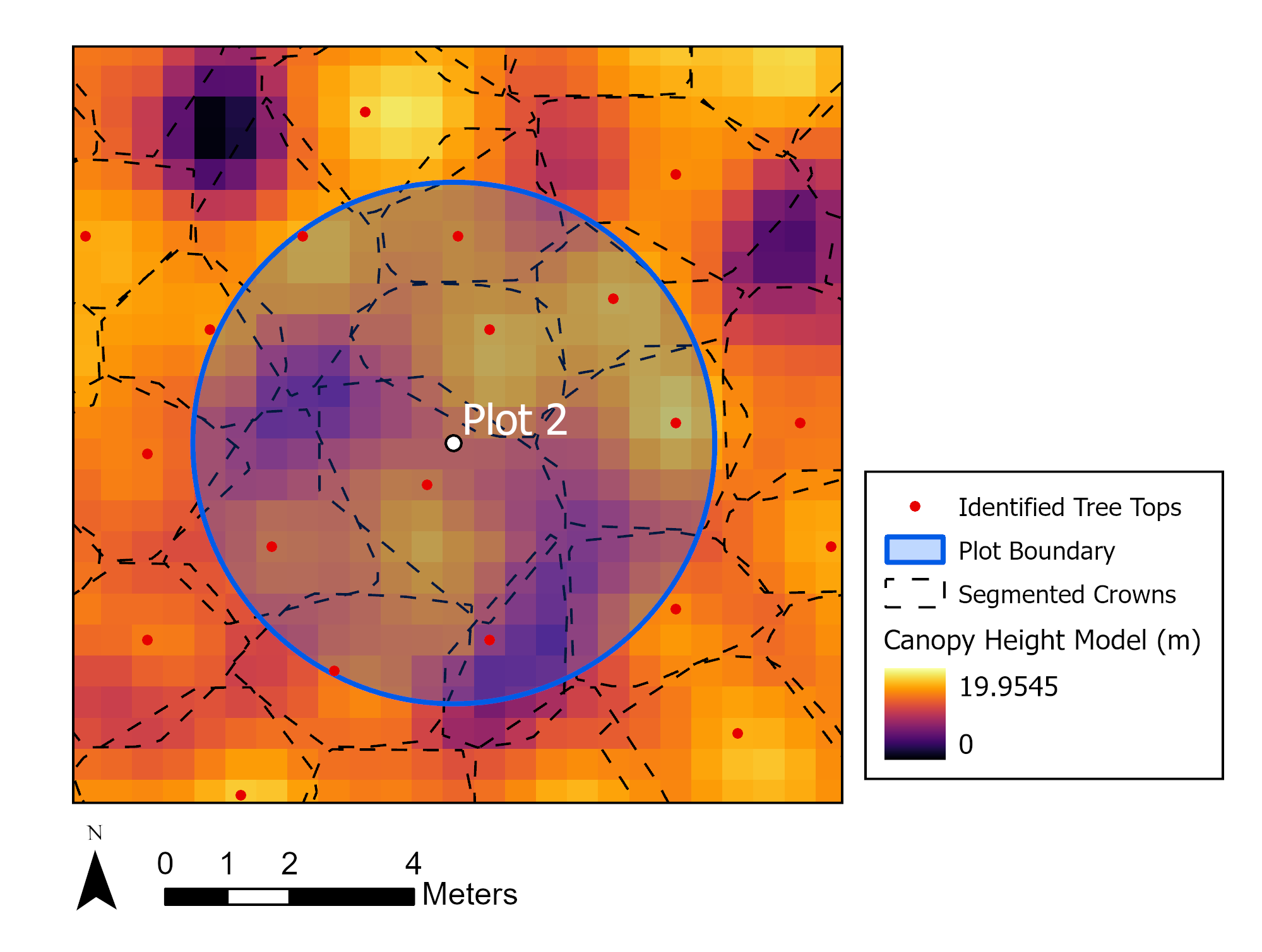 Example of individual tree segmentation accuracy within the boundary of plot-level field data, overlaid on the canopy height model.