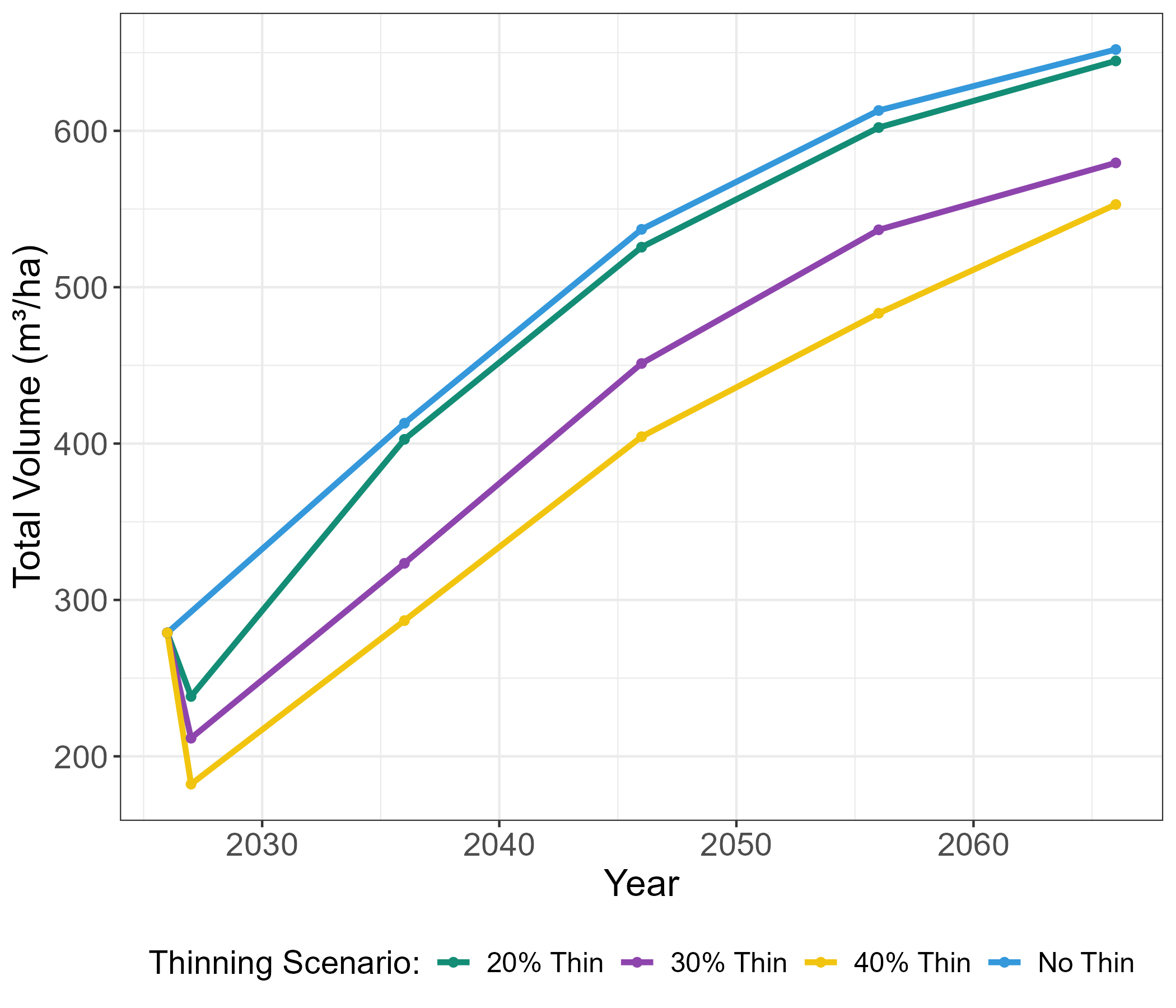 Modelled stand volume (m³/ha) 40 years into the future under four growth scenarios.