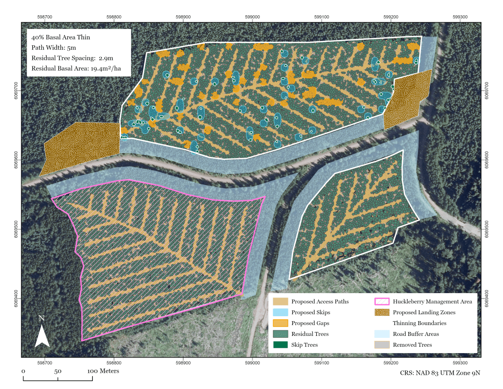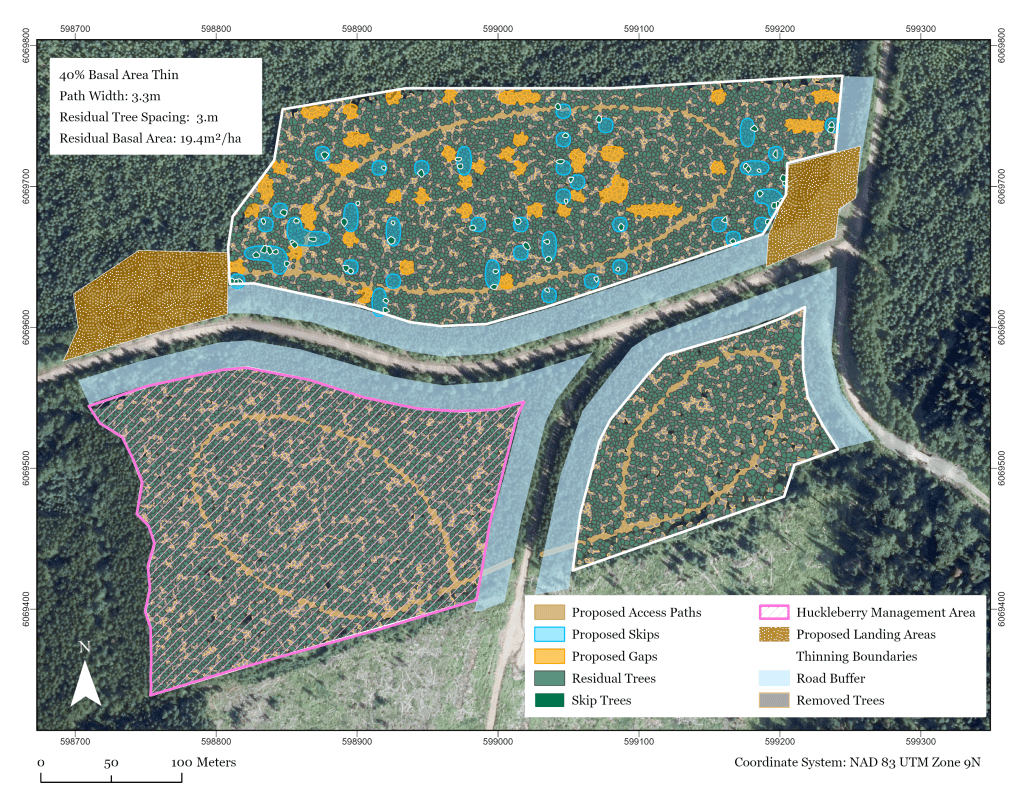 A targeted literature review was conducted to inform thinning objectives and operational parameters. The review focused on four primary objectives: (1) enhancing wildlife habitat and understory biodiversity, (2) improving growing conditions for huckleberry (Vaccinium spp.), (3) reducing wildfire and forest health risks, and (4) addressing operational and regulatory constraints.