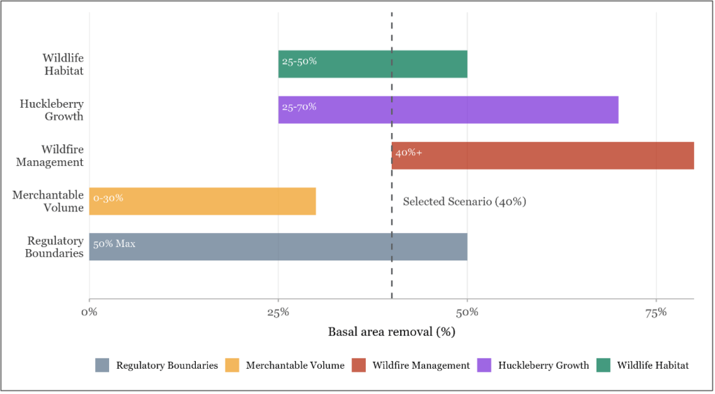 The central finding of this study is that ecological, cultural, and operational thinning objectives are not fundamentally conflicting. While some studies identify significant trade-offs between timber and biodiversity objectives in boreal forest thinning context, the objectives examined here proved largely complementary at a moderate basal area removal intensity. A moderate prescription was sufficient to theoretically advance habitat creation for ungulates, huckleberry growth potential, and wildfire risk management without imposing prohibitive operational constraints or significant economic costs. The small reduction in total merchantable volume identified through FVS growth modelling represents the primary trade-off, although the small decrease suggests that community forests managing for multiple values does not necessitate sacrificing timber productivity to pursue ecological and cultural goals.