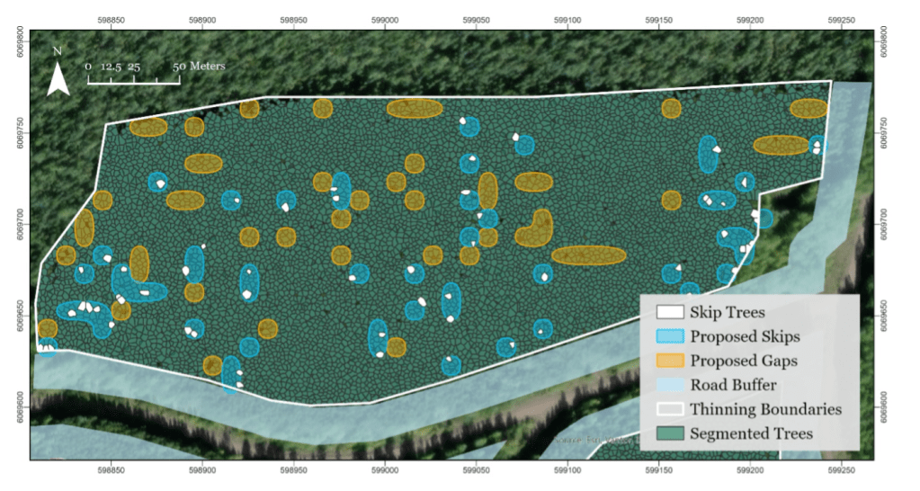 Skips areas were designated around trees in the 99th height percentile were identified as skip candidates. The tallest and likely oldest trees in the stand area important for habitat structure.