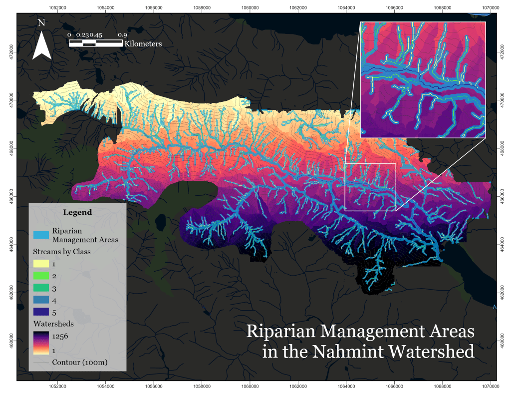 This analysis delineated Riparian Management Areas within the Nahmint Watershed by applying British Columbia’s Riparian Area Management Guidelines to a digital elevation model, integrating terrain-based hydrological modeling and stream network analysis to establish buffer zones for future land and resource management.