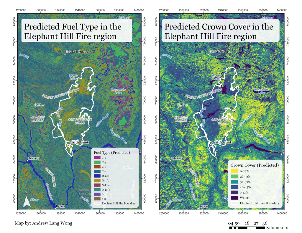 This fuel type and crown cover analysis of the Elephant Hill wildfire burn area was created from multiple remote sensing and climate data sources. Using a Random Forest machine learning classifier trained on Landsat indices, VRI data, ClimateNA variables, and ASTER imagery, wall-to-wall estimates of crown closure and fuel type class were predicted.