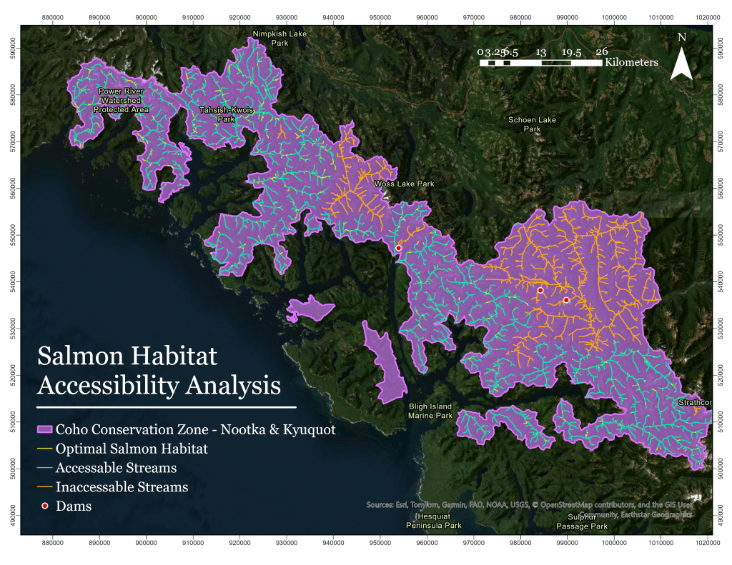 This salmon stream habitat and accessibility analysis was derived from a digital elevation model of the Vancouver Island. Using hydrological extraction, network topology, and linear referencing tools in ArcGIS Pro, this process modelled stream order, slope gradient, and spawning habitat suitability to evaluate accessible upstream habitat for Pacific Salmon.