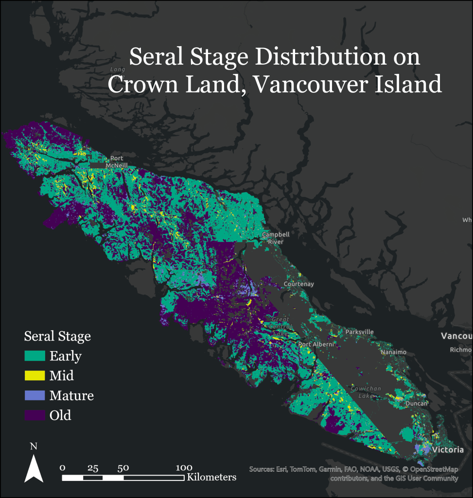 This seral stage distribution analysis was created using the Vegetation Resources Inventory for Crown land across Vancouver Island. Using attribute standardization, forest management landbase filtering, and area calculation techniques in ArcGIS Pro, forest successional stages and old-growth extent were quantified to better understand the current state of forest management.