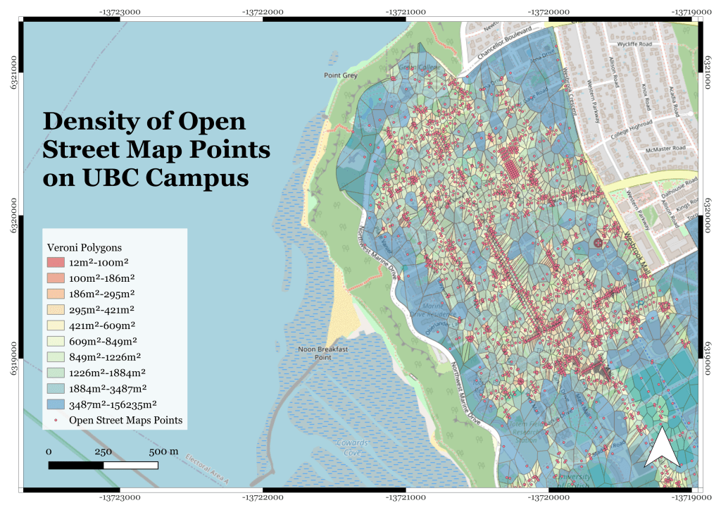This Voronoi density analysis was conducted on OpenStreetMap point data on UBC campus. Using the Voronoi polygon tool and spatial aggregation techniques in QGIS, the process partitioned geographic space based on the density of user-input map points. This project illustrates the strength of open-source data and open-sourced software for urban land use planning.